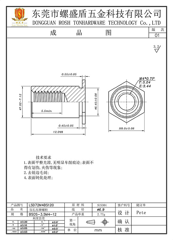 BSOS-M4-12 不銹鋼壓鉚螺母柱
