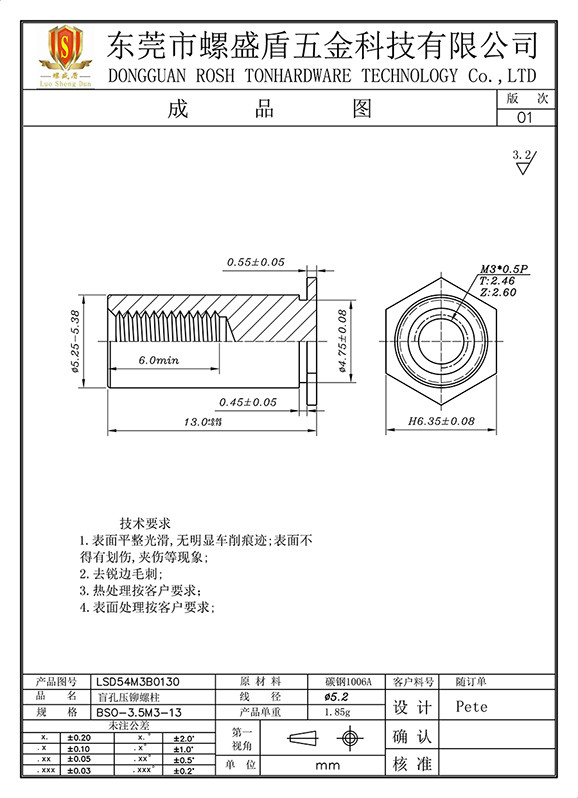 BSO-3.5M3-13 壓鉚螺母柱