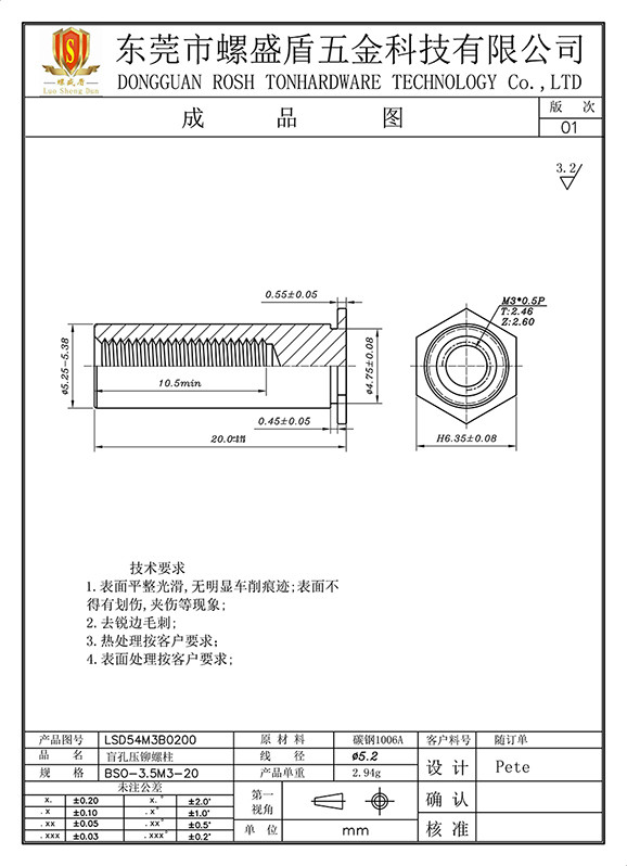 BSO-3.5M3-20 壓鉚螺母柱