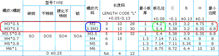 壓鉚螺母柱規(guī)格表中紅色框線圈出的兩行數(shù)值,螺紋X螺距一欄有兩個M3*0.5,而相對應藍色框線的螺紋代碼分別是M3和3.5M3兩種,它們有什么不同呢?我們再看綠色圈出的部分數(shù)值:螺紋代碼M3對應的板孔徑為4.2,螺紋代碼3.5M3對應的板孔徑為5.4。我們可以清楚知道螺紋代碼的數(shù)值匹配不同的板孔徑。