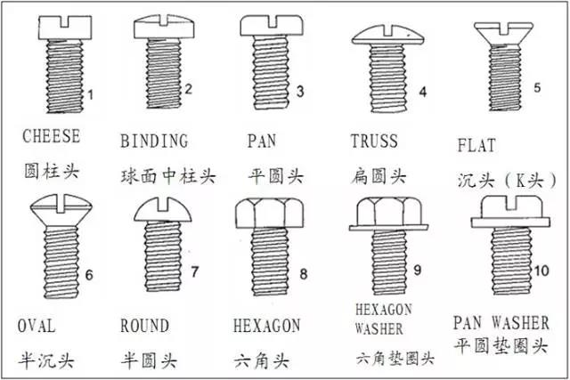 螺絲的頭型厚度與直徑大小一般可以自定義,通常頭部直徑比螺桿單邊大0.6mm以上,以能覆蓋住鎖不穿而定,太小會容易鎖穿。比如M1.4的螺絲,螺絲頭的直徑為2.6mm.塑膠螺孔開孔直徑為1.6,單邊覆蓋0.5mm。隨著產(chǎn)品設計不同,螺絲規(guī)格變大,設計參數(shù)也有改變,比如M3.0的螺絲,開孔就要做到3.5以上,那么螺絲頭的直徑就要做到5.0以上才是安全的。設計參數(shù)要以實際的產(chǎn)品設計要求去定義。 下面是幾種常規(guī)螺絲的頭型。