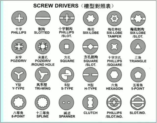 螺絲的槽型決定了裝配與拆卸時用工具頭的形體,常規(guī)設計時盡量采用十字與一字的。詳情見下圖。