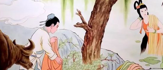 牛郎出身貧寒,年紀(jì)不小了, 還是孑然一身。他有一頭老黃牛,一天,老黃牛對(duì)他說:“河里有一群姑娘在洗澡,她們把衣服脫在河沿上,有一套白色的衣服,你把它拿走,那件衣服的主人就是你的妻子。”