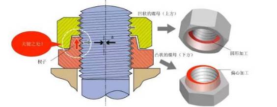 據說發明人若林克彥介紹說,這種螺母是這樣做到永不松動的,通過在螺母和螺絲之間揳入楔子來防止產生松動。Hard Lock螺母有兩個“凹”“凸”狀的螺母組成,下方的螺母呈凸狀,在加工時采用中心稍許錯動的偏心加工,上方的螺母呈凹狀,采用圓形加工,這樣就形成了鞋子的效果,永不松動的螺母就問世了。