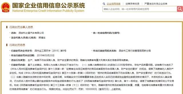 根據處理結果顯示:西安利之星汽車有限公司存在有銷售不符合保障人身、財產安全要求的商品,夸大、隱瞞與消費者有重大利害關系的信息誤導消費者的兩項違法行為,被依法處以合計一百萬元罰款。
